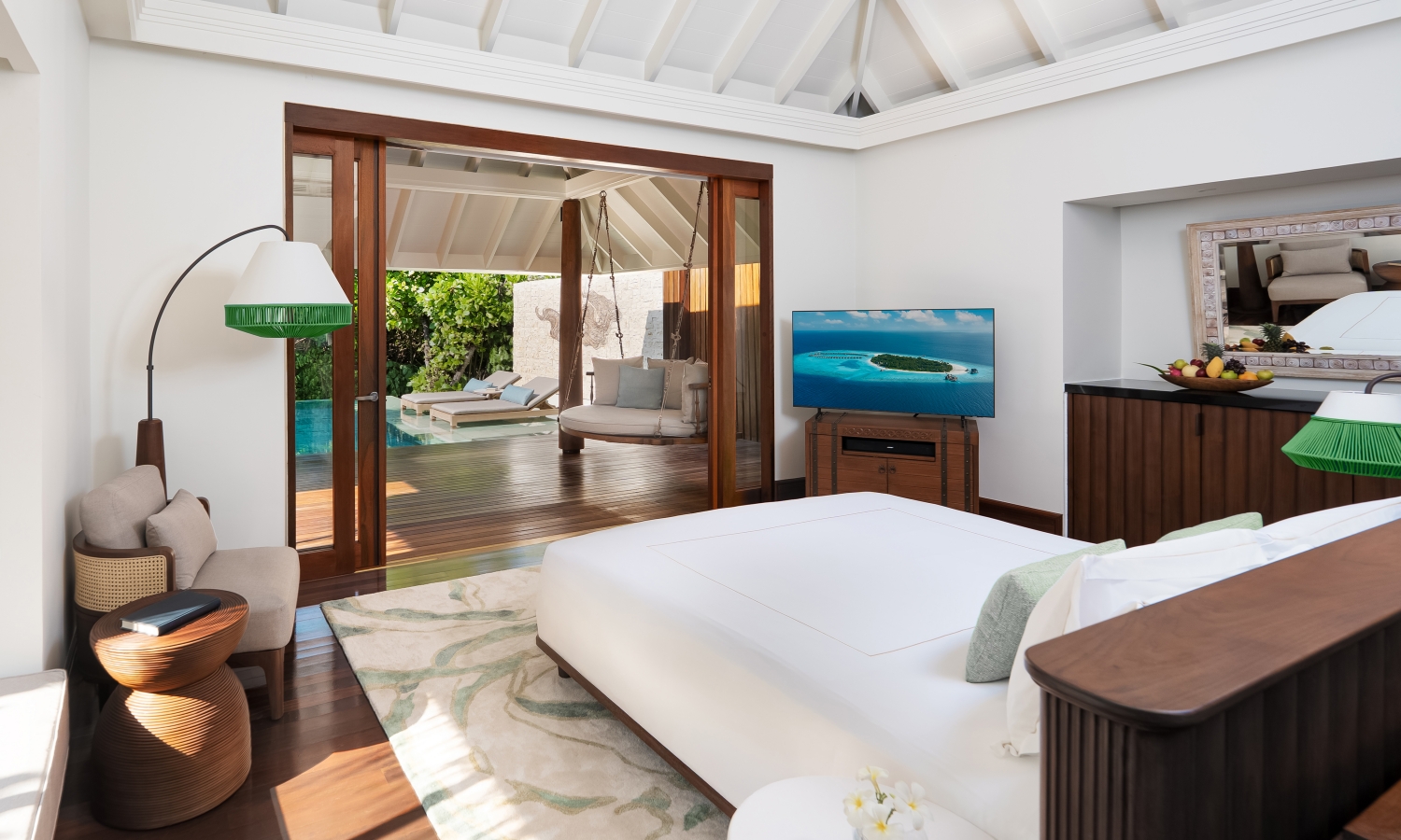 The Beach Pool Villas embody effortless indoor-outdoor living. Expansive glass doors welcome natural light, while handcrafted timber finishes and a calming neutral palette create an atmosphere of refined tranquillity. Stylish artwork, both inside and out, adds an elegant touch, seamlessly blending modern design with island aesthetics.