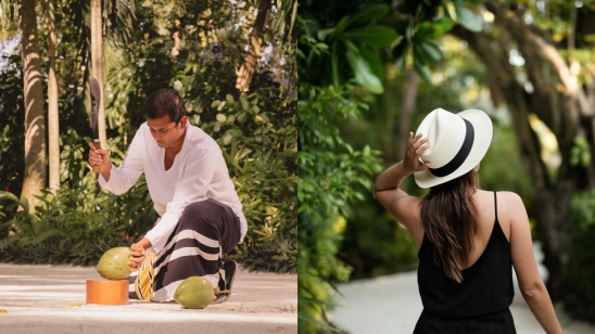 The resort features seven dining venues offering a mix of international and local cuisine. Tex Mex serves Mexican and Spanish-inspired dishes, while Dalchini offers an Indian à la carte menu available for lunch and dinner. Raalhu Bar provides a setting for evening refreshments, with views of the sunset.